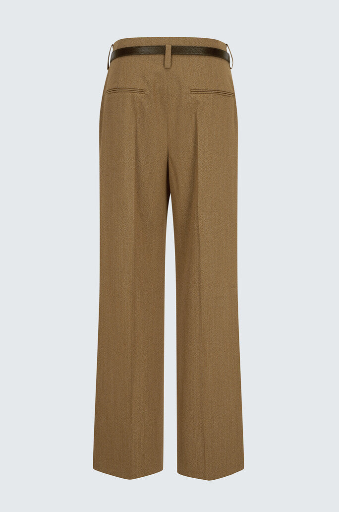 These pants are made of imported Italian wool blend material, providing a comfortable fit and luxurious quality. The wide silhouette falls loosely to the hem, and the folds along the front and back leg lines make the leg line look longer. The belt made of sheepskin material is included, allowing for a variety of styling options, and it is a great item to match with various tops.