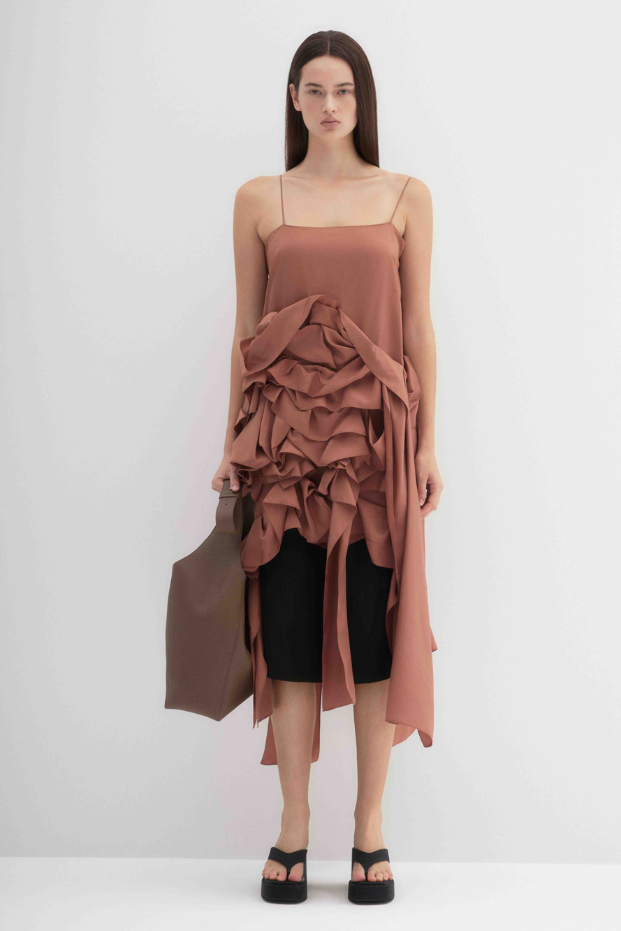 A delicate mini dress crafted from soft silk fabric. Designed in a slim strap silhouette, it can be worn on its own or layered for versatile styling. Voluminous ruffle details create a romantic focal point, while the back features a deep V-cut that flows into a long, elegant drape for a striking finish.