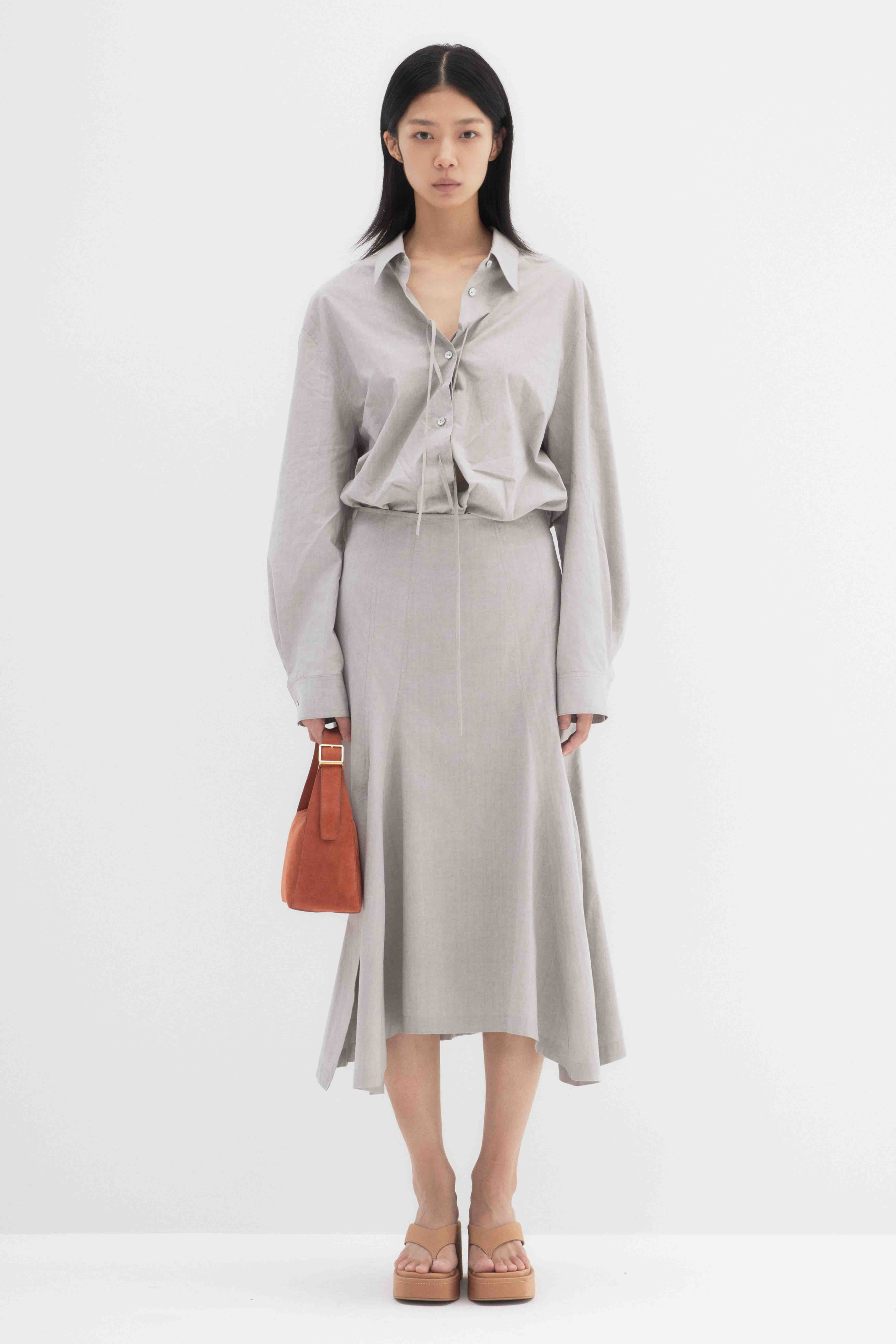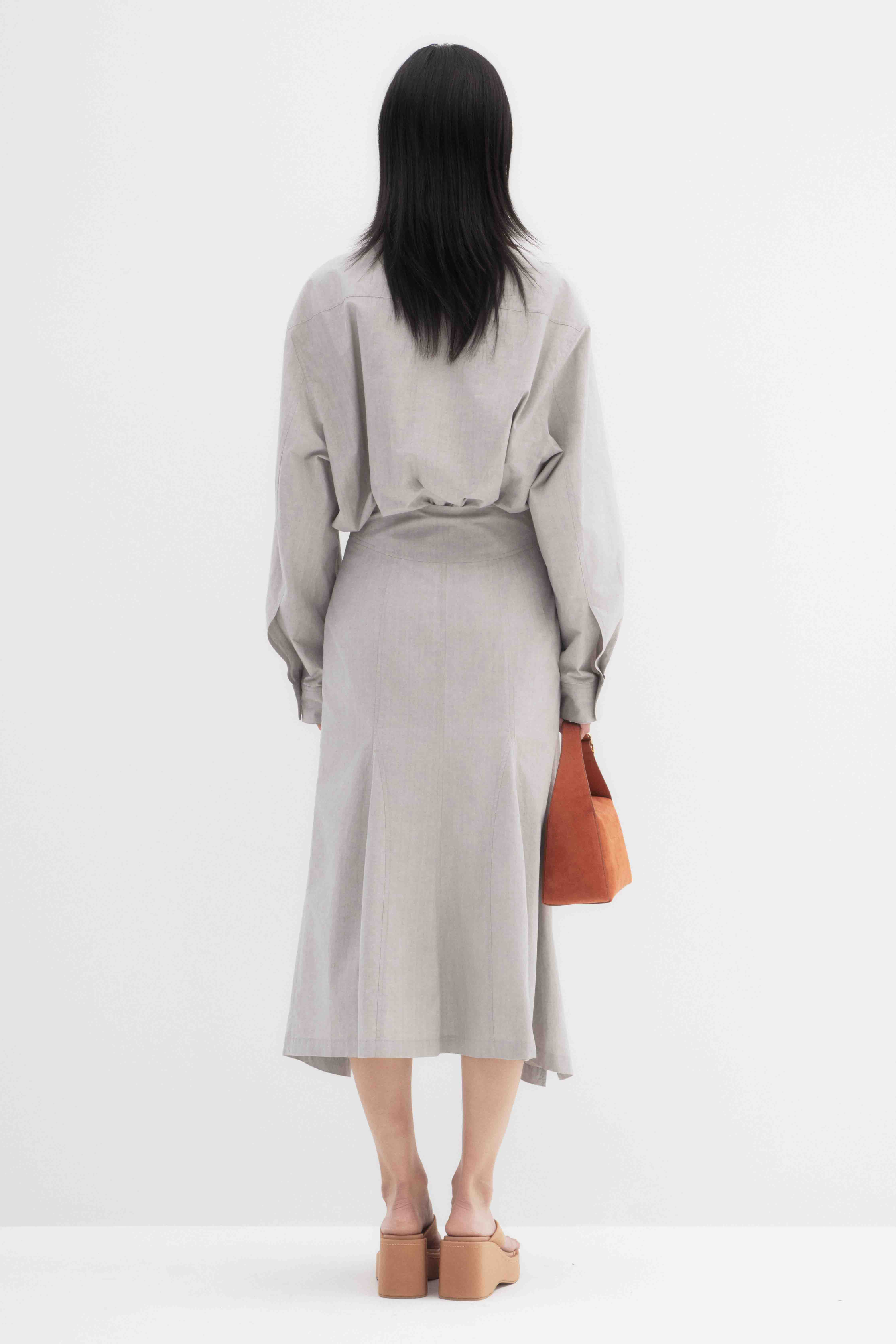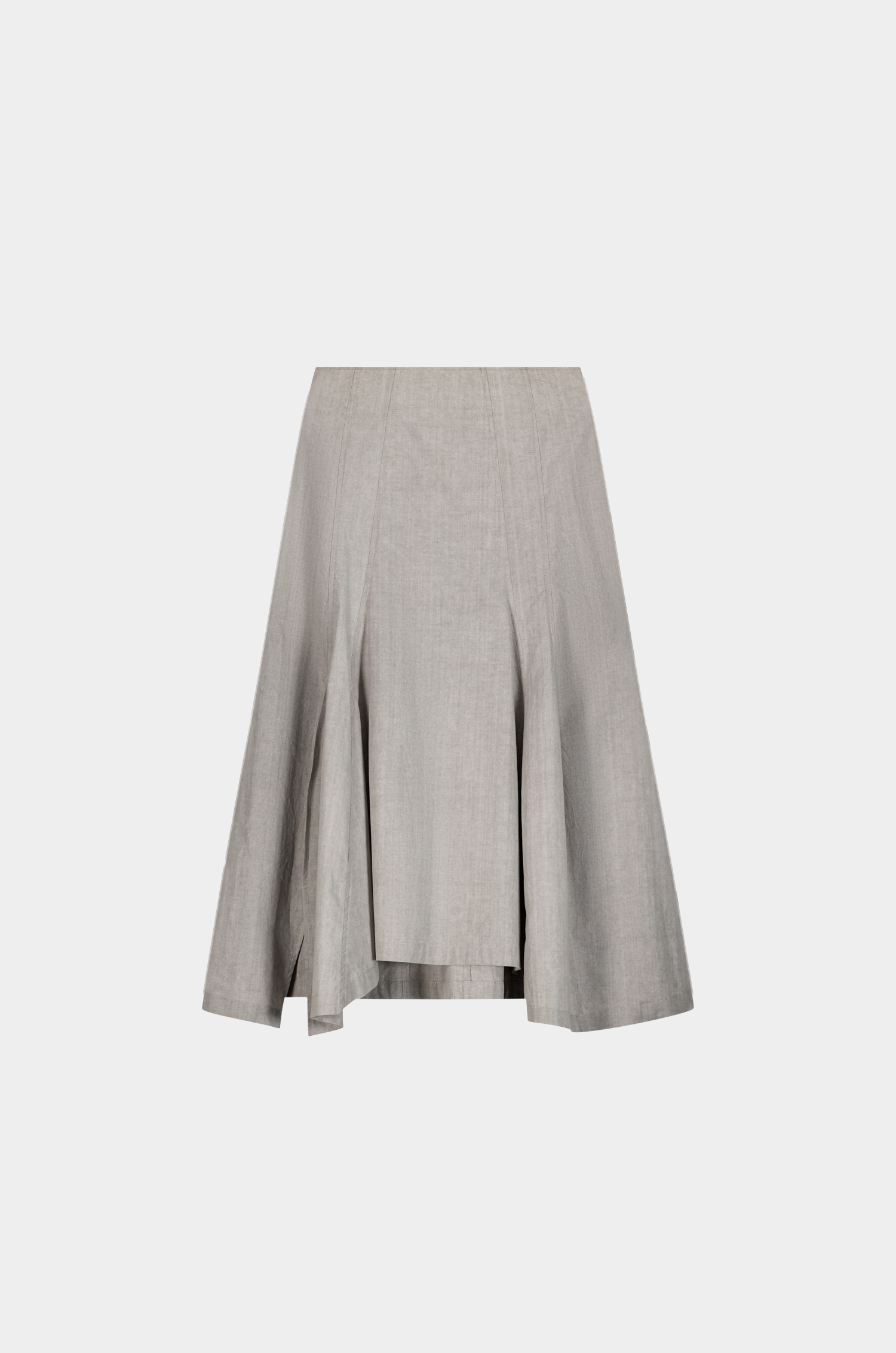 This cotton midi skirt features a clean, tailored silhouette with subtle front panels that add movement and dimension. The high waist and slight A-line shape create a flattering fit, making it perfect for both casual and dressed-up looks.