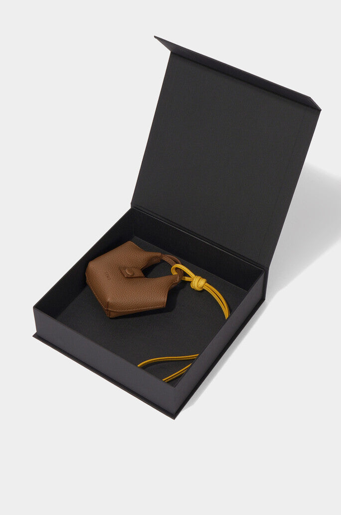 This bag charm boasts a luxurious quality, crafted from supple cowhide leather. The top snap button closure provides secure storage, and the knotted strap detail adds a sophisticated touch. Despite its compact size, its structured shape elevates your style and allows you to wear it on your wrist or hang it from a bag.
