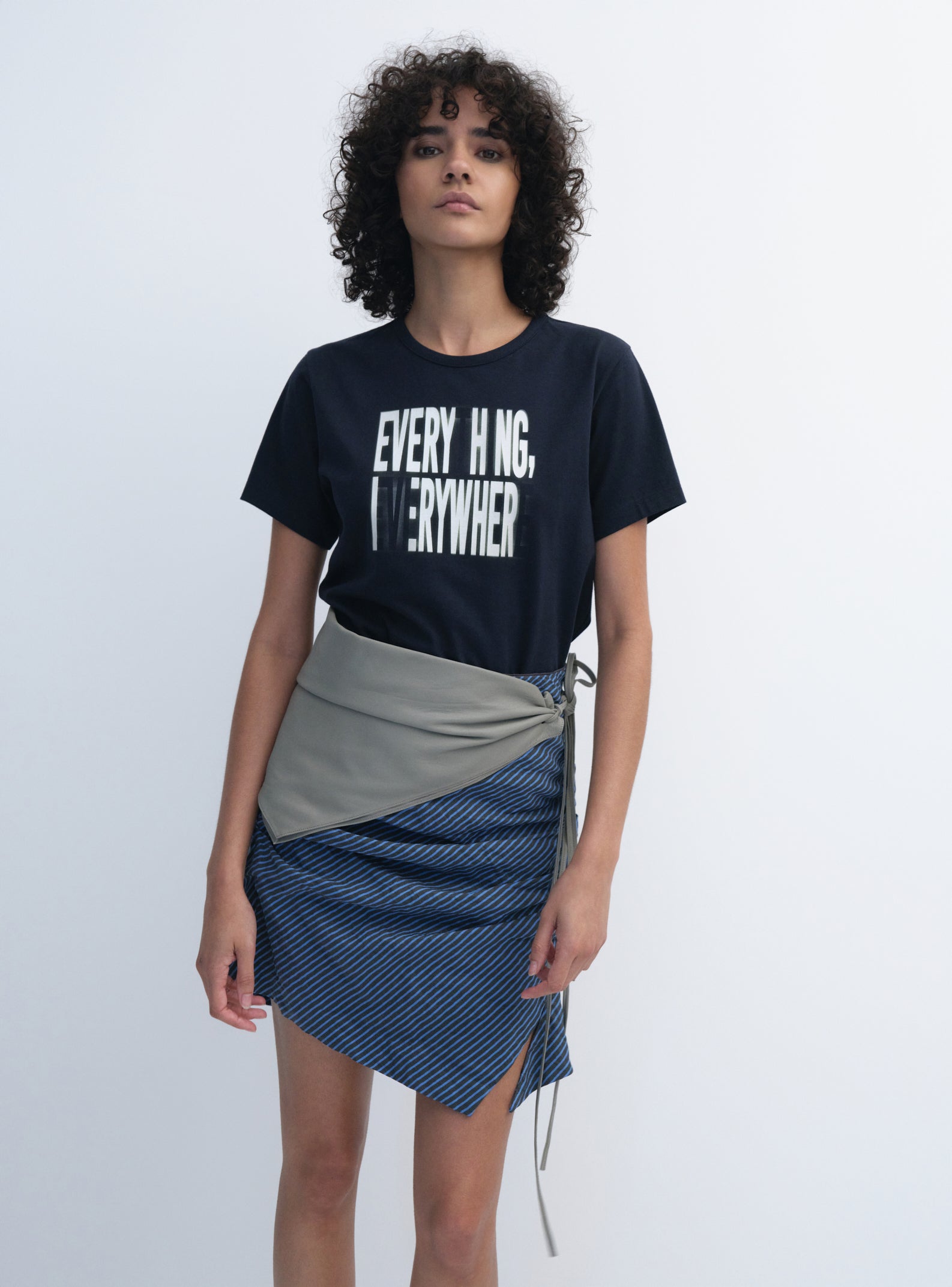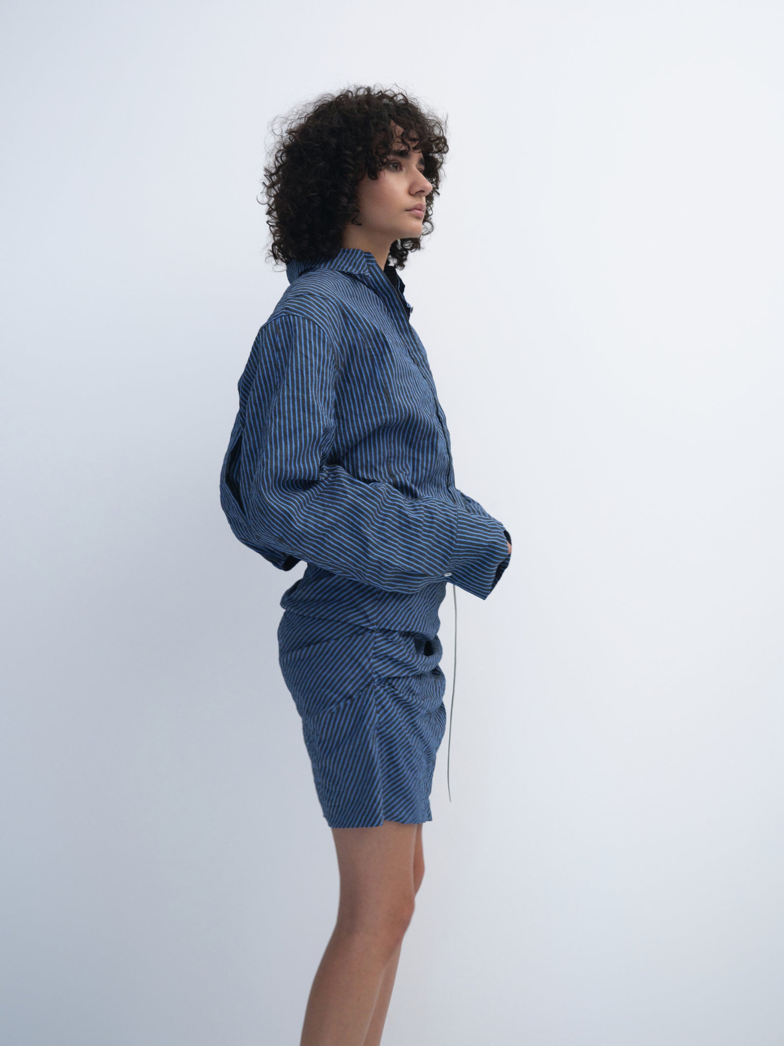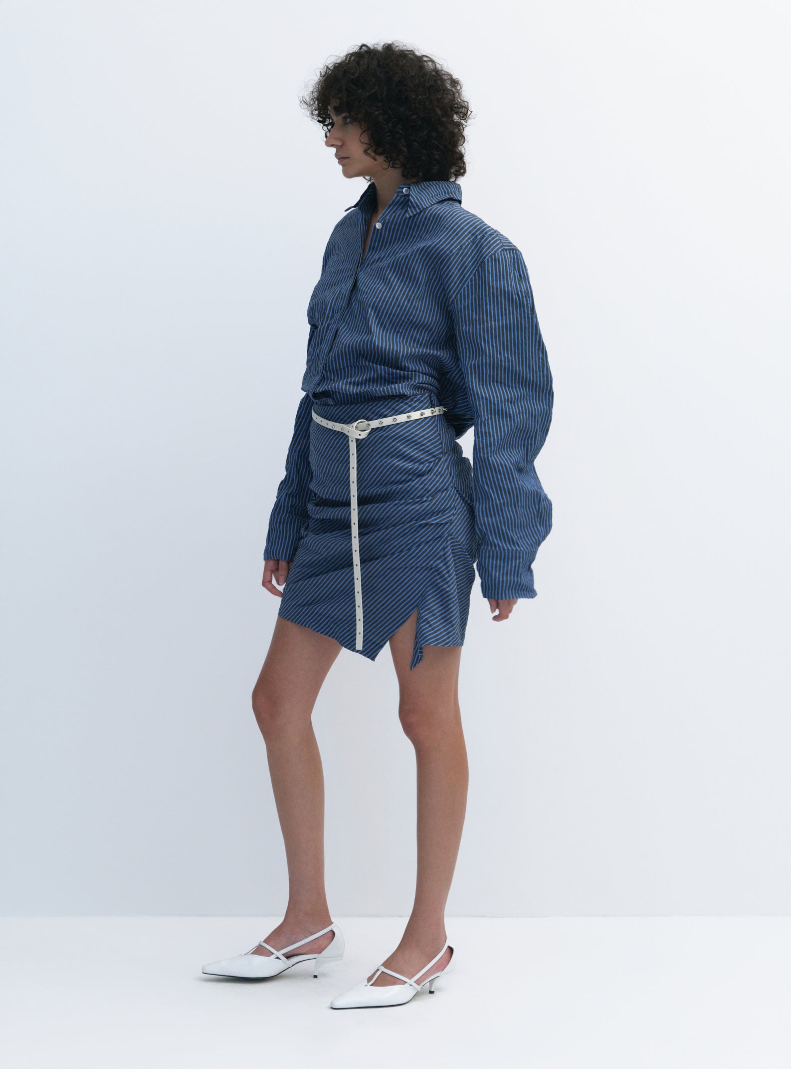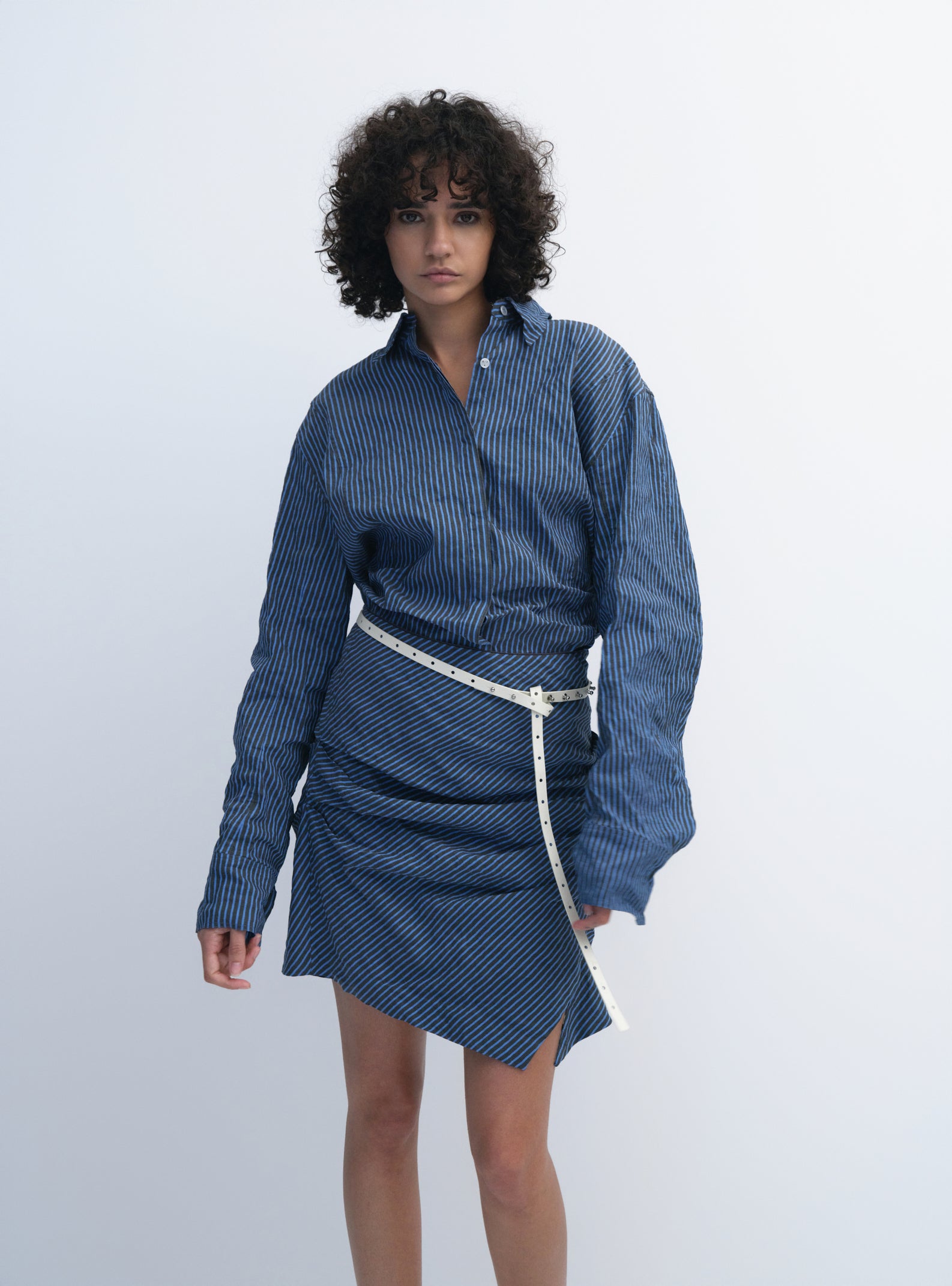 Made from a luxurious cotton-metal-silk blend, this skirt is designed to be worn as a set with the Striped Shirt. Horizontal ruching shapes the silhouette, creating a flattering, structured look, while the above-the-knee length adds a modern touch. A subtle slit on one side enhances movement and visual interest, making it perfect for both casual and dressier occasions.