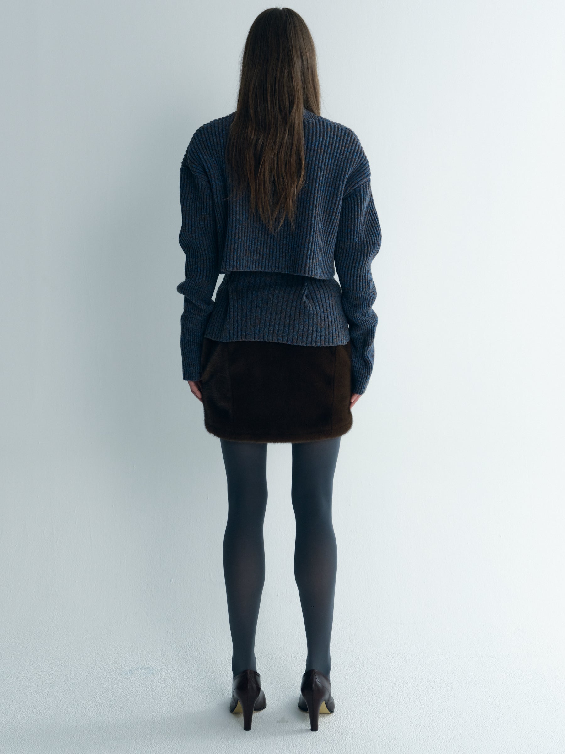 This cropped wool cardigan features a slightly raised neckline and is crafted from 100% wool with a blended two-tone color design. The soft knit provides warmth and comfort, while the cropped silhouette and ribbed trims create a structured yet relaxed look. The button-front closure makes it easy to style, perfect for layering over high-waisted bottoms or dresses for a chic, effortless finish.
