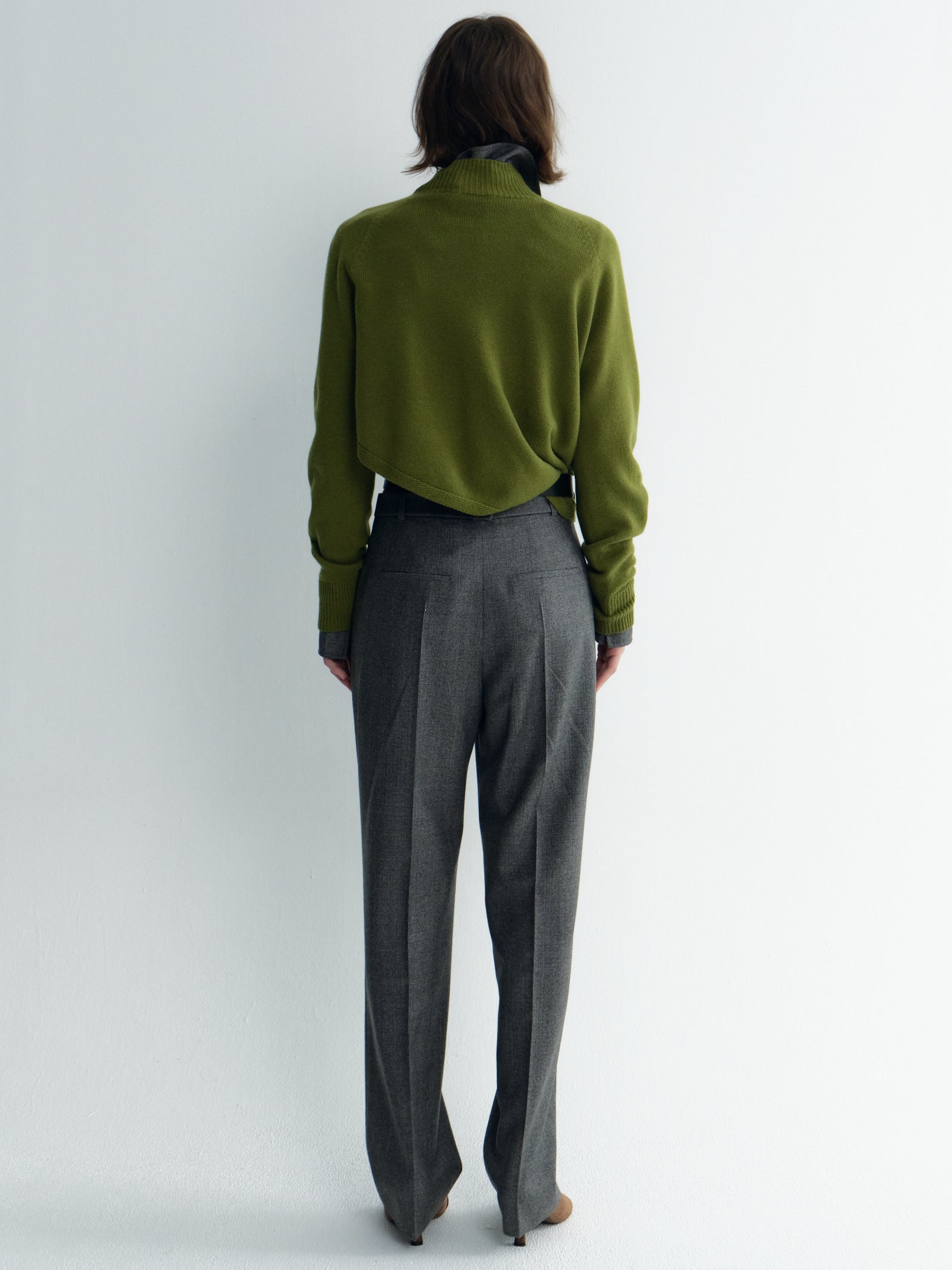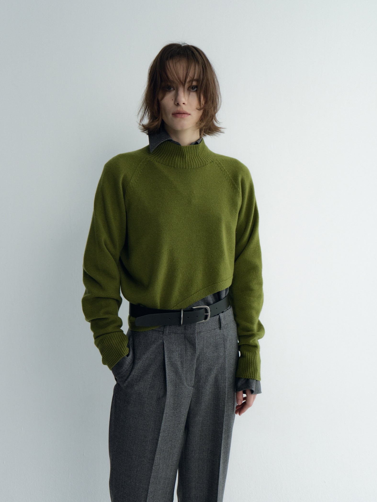 A modern cropped knit top crafted from a soft cashmere for warmth with a lightweight feel. Designed with an asymmetric hemline for a subtle yet distinctive silhouette, it brings a contemporary twist to classic knitwear. Perfect for pairing with high-waisted bottoms for a balanced, flattering look.